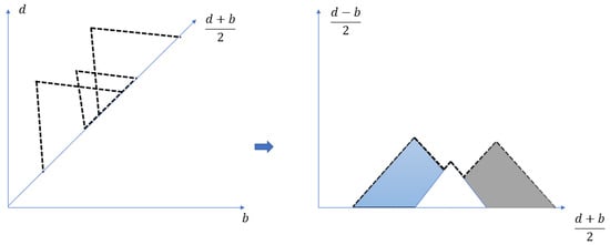 A visual example of the transformation of a persistence diagram representation (PDR) into a persistence landscape (PL). The horizontal axis represents birth time, while the vertical axis represents death time on the persistence diagram (left). The horizontal axis is the average of the homologies of the birth and death times, and the vertical axis is used for on the persistence landscape (right).