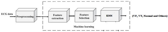 Schematic diagram illustrating the feature selection process proposed for the discrimination of ventricular arrhythmias, normal sinus, and other types of rhythms.