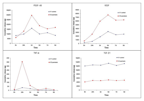 Healthy V1 presented a normal range release, as previously reported [14]. PDGF-AB had a constant accumulation reaching the top on the 3rd day; VEGF increased during the experiment period, reaching the maximum accumulation on the 6–8th day; TNF-α reached the maximum accumulation on the 1st day and then progressively decreased until the 8th day; TGF-β1 had a constant accumulation during all the experimental periods.