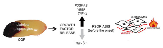 New systematic treatment approaches for psoriasis are numerous with the aim to improve patients’ quality of life; however, there is still a need for new therapeutic alternatives where these treatment modalities are not suitable. If the finding of this study could be confirmed by a wide clinical study, a new hypothesis could be made about the involvement of the platelets in the onset of this pathology, and the CGF could be a useful in vitro tool to evaluate the kinetic release of growth factors over time; moreover, it could simulate the psoriasis microenvironment in 2D and 3D human skin models.