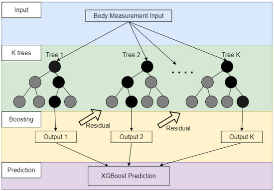 In past decades, ML techniques have been utilized to solve the classification and regression problems [7], leading to many noteworthy applications such as wind speed prediction [8], temperature forecasting [9], solar irradiance forecasting [10], train arriving time prediction [11], construction strength prediction [12], speech recognition [13], image recognition [14], etc. ML techniques have been used in human body-related areas [15,16,17]. Wuhrer and Shu [15] proposed a method combined with a statistical shape model of easy-to-obtain measurements to create 3D human shapes. Kocabas et al. [16] proposed a self-supervised method to estimate a 3D body pose from multi-view images. Xu et al. [17] reviewed the recent work in point cloud-based pose estimation of the human body in various applications such as human–computer interaction, video analysis, and autonomous driving. ML techniques have also demonstrated good performance in 3D Body Measurement (BM) as an accurate estimator and the closest works to this paper are in [18,19,20]. Baek and Lee [18] developed a parametric human body shape modeling system and generated body shape models based on the input body sizes via radial basis function. Lu et al. [19] proposed a novel prediction model to estimate the body fat percentage by analyzing 3D body shapes following the concept of ‘visual cue’ by analyzing the second-order shape descriptors and establishing the baseline regression model for feature selection of the zeroth-order shape descriptors with improved baseline prediction. Liu et al. [20] proposed a backpropagation artificial neural network to predict pattern-making-related body dimensions by inputting a few key human body dimensions via the database of anthropometric measurements of 120 young females from the northeastern region of China. However, the above references do not directly address the data missing issue from the 3D body scanner. Furthermore, none of these works consider the combination of feature selection and Bayesian search, which could greatly improve the training efficiency and prediction accuracy.