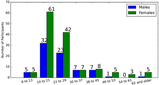 The proposed ML methods enable a novel 3D BM estimation framework to be simulated in Python on a desktop computer with the Intel Xeon CPU E5-2640 dual processors and 256 GB RAM. The database is built via the collection of 3D BM in the Kansas-Missouri area in the United States. Figure 5 shows the distributions of the age and gender groups in the dataset. There are 76 males and 136 females out of the 212 participants. The age of the participants ranges from 6 up to 75. General statistics of the dataset are listed in Table 1. There are 6 body features, i.e., “body height”, “weight”, “head girth”, “arm girth”, “sitting height” and “head height”, which are chosen as representatives to show the variety of the dataset based on the minimum value, maximum value, mean value and the standard deviation (std).