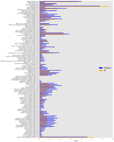 Figure 6 shows the MSE results after the Bayesian search for the XGBoost and the RF with all features including a total of 117 body features. Only one feature is considered to be predicted—the output of the ML model—while all of the other body features are taken as input to the ML methods. For instance, the blue and yellow bars labeled “Body Height (in)” in Figure 6 represents that the body height is the only feature to be predicted while all of the other body features (i.e., features) except for the “body height” are taken as input to the ML methods. The blue bar represents the MSE result from XGBoost and the orange bar represents the MSE result from RF as shown in Figure 6. It is seen that some features, e.g., “body height”, “weight”, and “waist to hip ratio”, have comparatively large values; nevertheless, most of other features show comparatively smaller values, i.e., “waist to buttock height left” and “waist to buttock height right”, etc. According to Equation (4), the MSE increases as the difference between the actual value and the predicted value increases. In addition, MSE is scale-dependent which leads to the result having a large value variety among different body features. However, MSE has the ability to obviously display the bias of how the ML model fits the data.