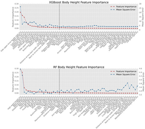 Figure 7 shows the result of estimating the body height using the XGBoost (the top subplot) and the RF (the bottom subplot). In either subplot, each tick on the x-axis is labeled with a feature name, corresponding to a feature in the datasets. Only 60 features out of the total 117 are presented on the x-axis for the simplicity of the presentation. As seen, the feature importance and the MSE are on the first and the second y-axis, respectively. The red dotted-line represents the value of feature importance for current feature shown on the x-axis. As seen, the red dotted line is monotonically decreasing, which means the features become less important along the x-axis. In other words, the feature importance is ranked in a descending order along the x-axis. For instance, the most important feature for the body height estimation using the XGBoost (the top subplot) is the “side upper torso length right”, while the most important feature for the body height estimation using the RF (the bottom subplot) is the “high waist height”.