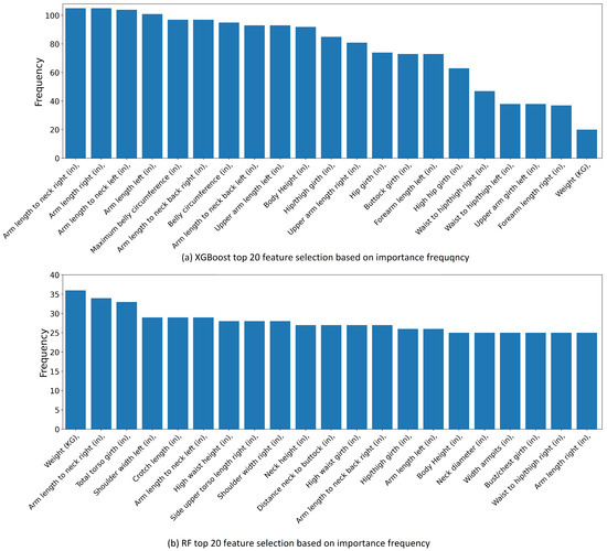 Figure 8 shows the top 20 most important features for the XGBoost (the top subplot) and for the RL (the bottom subplot). The frequency on the y-axis of each subplot represents the occurrences when this feature lies within the top 20 features in predicting all 116 other features. For example, the top feature for the XGBoost is the “arm length to neck right” with a frequency of over 105. This indicates that this feature is among the top 20 features for predicting all the other 116 features. As seen in Figure 8, the most important body feature for the XGBoost is the “Arm length to neck right” with a 105 frequency. However, the most important body feature for the RF is the “weight” with a 36 frequency. The feature selection is applied based on the results in Figure 8. The top 20 body features with the highest frequency are selected for each ML model, the performance of which will be tested and analyzed next.