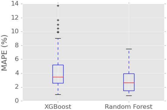 To further examine the performance of the two ML methods with the proposed feature selection, box plots of the MAPE for predicting all the body features are shown in Figure 9. As seen, the minimum MAPE of the XGBoost and the RF is similar; however, the maximum MAPE of the XGBoost is around 14% while the maximum MAPE of the RF is 8%. Analogous to Table 3, the mean MAPE of the RF is lower than the that of the XGBoost. The results in Figure 9 demonstrate that the RF has a better performance than the XGBoost when a combination of Bayesian search and feature selection is used.