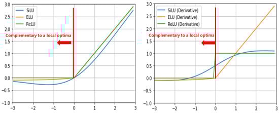 Graph comparison of SiLU, ELU, and ReLU activation function (Left figure is function, Right figure is a derivative function).