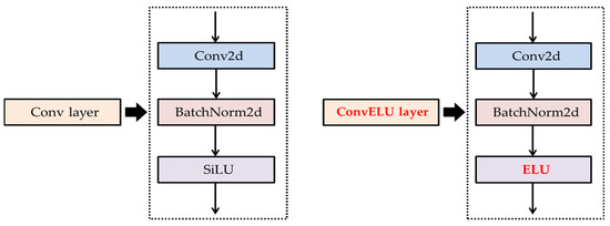 The SiLU (Swish) activation function can solve these problems, but it is only available in the hidden layers of deep neural networks and has the disadvantage that it can only be used in reinforcement learning-based systems. To solve this comprehensive problem, we used ELU (Exponential Linear Unit) as an activation function. SiLU activation function, which was previously used in the Conv layer, was replaced by the ELU activation function, as shown in Figure 3.