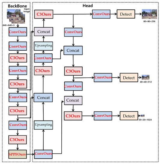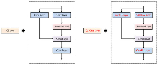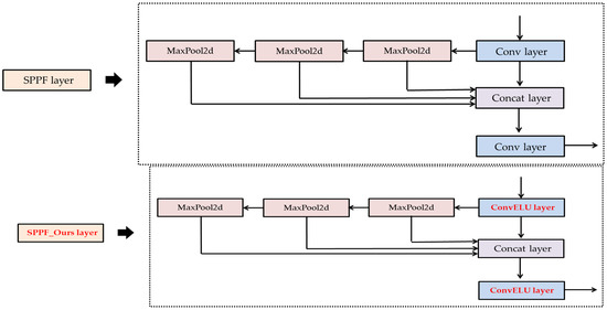 Both the SiLU activation function and ELU activation function can solve dying RELU, but the SiLU activation function has a problem of limited use, so we replaced it with the ELU activation function. We created the Conv layer with the activation function ELU applied, and we applied this to all of the ConvELU layers in the YOLOv5_Ours structure, as shown in Figure 3, Figure 4 and Figure 5.