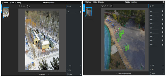 The collected data were then labeled from the online platform makesense (http://www.makesense.ai/, accessed on 14 July 2019) [40]. As shown in Figure 9, the label was created as three objects: person, car, and notice and annotated, and the annotated image was converted to a txt format according to the YOLO format.