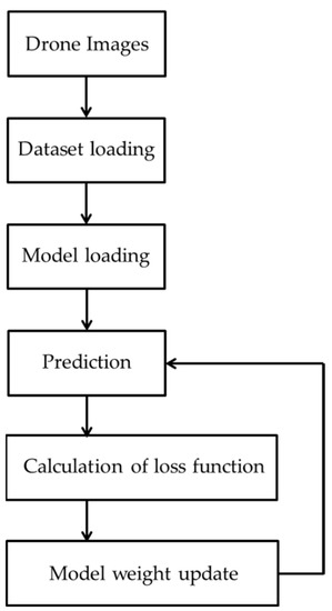 We were three classes: person, car, and notice labeled to be annotated according to the purpose of the study. This is because we thought it was the easiest thing to confuse with objects based on the photos taken. All data taken by drone were labeled with three objects: person, car, notice in this way. Through training, the loss function is calculated, and the best weight is updated in models: the original YOLOv5 model and YOLOv5_Our model. After that, we proceed with the validation and testing process with the best weight obtained through training. Then, predict the test data with the obtained weight.