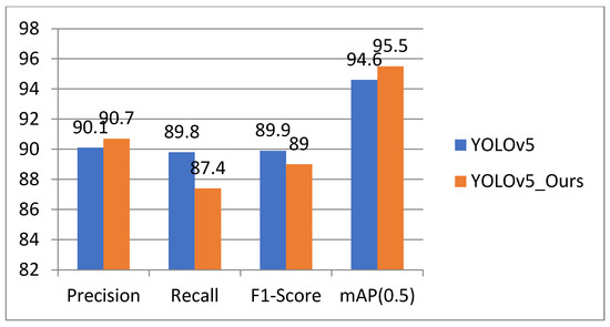 The original YOLOv5 model and YOLOv5_Ours model were trained at 100 epochs and with the 3360 images: training images, validation images, and testing images. As a result of training all models, the average time spent training was about 2 h per model. The model that took the most time was the original YOLOv5 model, which took 2 h and 10 min. The object detection comparison results of the two models (the original YOLOv5 model and the YOLOv5_Ours model) are shown in Table 2 and Figure 11. Additionally, this table shows the Precision, Recall, F-1 score, and mAP of the original YOLOv5 model and YOLOv5_Ours. We compared based on the best of the 100 epochs result values. In order to objectively evaluate the performance of the models, the values of mAP (Mean average precision) were compared. The mAP value of the original YOLOv5 model is 94.6%, and YOLOv5_Ours is 95.5%. Overall, it may be seen that the YOLOv5_Ours model has higher than the original YOLOv5 model.