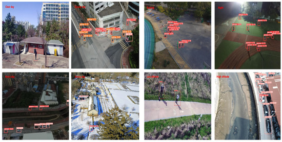 Additionally, drone photographs were added from VisDrone (http://aiskyeye.com, accessed on 5 June 2021) [38] to collect more diverse data. VisDrone is a dataset used annually for object detection using drones and is very reliable [39]. This is to increase the accuracy of the experiment through reliable data combinations. In the VisDrone dataset, only data photographed above 10m: High altitude were added to meet the existing data and standard. Figure 8 shows the samples used in the experiment. In the final dataset used in the experiment were 2080 images: Clear, Cloudy, Rainy, Snowy day, Evening, Night, Low altitude, High altitude in training, 960 images: Clear, Cloudy, Rainy, Snowy day, Evening, Night, Low altitude, High altitude in validation, and 320 images: Clear, Cloudy, Rainy, Snowy day, Evening, Night, Low altitude, and High altitude in testing, prepared a total of 3360 images: Clear, Cloudy, Rainy, Snowy day, Evening, Night, Low altitude, and High altitude. Details are summarized in Table 1.
