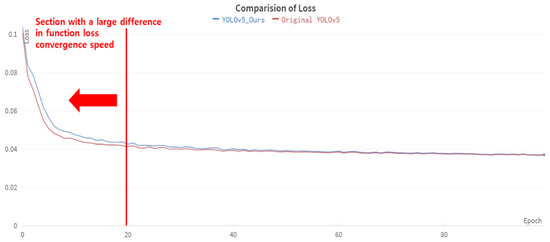 It can be seen that YOLOv5 function loss occurs rapidly at the beginning of training. On the other hand, YOLOv5_Ours decreased function loss slowly. The gap appears to be narrowing until the epoch reaches 60. After that, the function loss of the two models: Original YOLOv5 and YOLOv5_Ours, is a little different. Figure 14 shows a graph comparing the function loss value of the two models. That is, YOLOv5_Ours means an efficient model with low convergence speed.