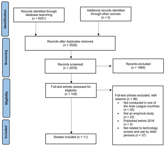 A total of 11 relevant citations were identified through our search strategy. In this section, we first present the characteristics of the selected papers and their participants’ demographics. Second, we answer the research objectives. Two distinct themes were analyzed: (1) technology access and use by older persons in the Arab region and (2) reported challenges and facilitating conditions around older persons’ ICT access and use.