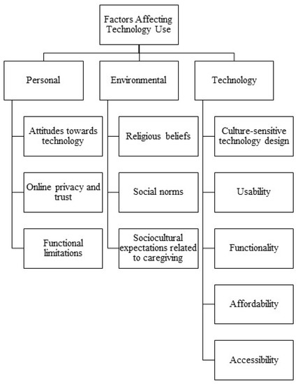 - Technology-related factors are part of the environmental factors. However, since this paper’s focus is ICT access and use, we analyzed technology-related factors separately. This category encompasses factors explicitly related to the technology, such as usability.