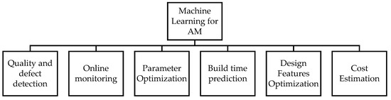 The density of the building part influences mechanical and microstructure properties. In additive manufacturing, material densification is the most crucial factor to consider [28]. The optimum range of process parameters is required to achieve a denser product. The part produced with the lower energy density may have unmelted particles, which results in a porous structure. The higher energy density creates a steep “V” shaped melt pool and leads to micro evaporation; thus, gas gets trapped below the melt pool and results in porosity. Tucho et al. [21] experimentally obtained the energy density levels for minimum and maximum porosity for SS316L as 80 J/mm3 and 50 J/mm3, respectively. Hence, optimization of process parameters needs to be explored to get minimum porosity. Cherry et al. [24] also investigated the importance of optimum laser energy density for minimum porosity. They observed a similar trend; as energy density increases, porosity increases to a certain level and then decreases. Further, Li et al. [29] correlated the melt pool shape variation with the porosity. The higher scanning speed creates a tiny size melt pool, leading to a higher porous structure with lower tensile strength. Dewidar et al. [30] also experimented with the porous structure for bone implants with 40 to 50% porosity which has desired elastic modulus of 26 GPa for the human body. ML can improve the AM process capability in many ways, such as topology optimization, online monitoring, design features optimization, defect detection, and parameter optimization [28]. The application of ML for AM is presented in Figure 2 [31].