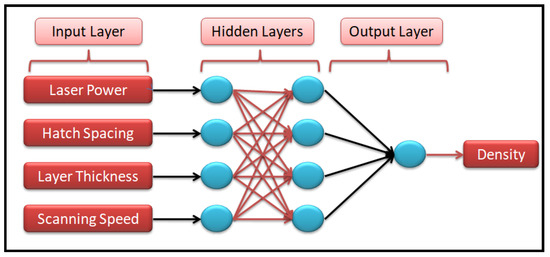 The ANN helps to optimize process parameters for newly developed materials to achieve desired mechanical properties. Desai et al. [55] used the ANN model to predict the effectiveness of the powder spreader for PBF of Ti-6Al-4V with 96% accuracy. Shen et al. [18] predicted the density of a Nylon-36 with 93% accuracy. Ahmadloo et al. [50] also used the ANN model to predict thermal conductivity with the minimum error of predicted vs. actual value of 1.26%.