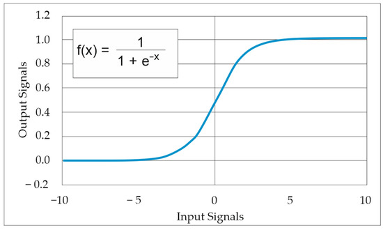 The general ANN structure contains the input layer, hidden layers, neurons, weights, activation function, and output layer [49]. The ANN algorithms first pick random data to build a relationship between the input parameters and neurons with different weights and activation functions. The ANN algorithm starts with the interlink neurons with different weights and continuously builds relationships to reach output values from training data. The weight in the ANN algorithm controls various input parameters on neurons [13]. Weights are multiplied with each neuron’s input and the activation function triggers the output of the neurons [50]. The activation function is a mathematical mechanism that passes information to subsequent neurons. An individual neuron works only when the activation function is triggered. Several activation functions are utilized in ANN algorithms, such as linear, Gaussian, sigmoid, hyperbolic tangent, saturated linear, etc. The sigmoid is the most used function in ANN, as shown in Figure 4 [51].
