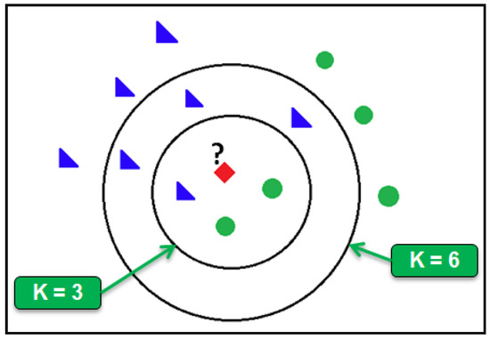 K-nearest neighbor (KNN) is preferred to be an accurate model for classification and regression analysis. KNN does not store any learning outcome from the training dataset. KNN classifies the unknown data with the most similar dataset [15]. KNN works on predicting results based on the nearest group of similar known outcomes from the training dataset, as shown in Figure 5. The only parameter involved in the KNN prediction model is the number of nearest neighbors (k) considered by the intellect to predict the output. The distance with the nearest neighbors is mostly calculated with the Euclidean distance measurement equation [15].