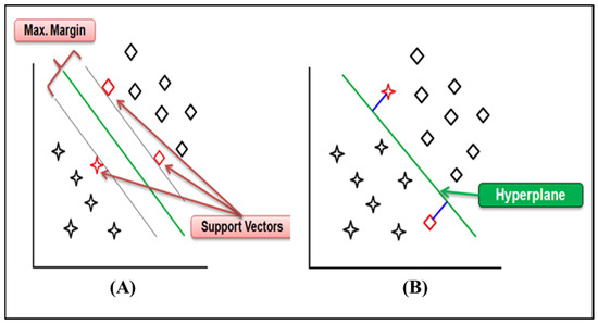 Support vector machine (SVM) defines the boundary between two different data types. These defined boundaries are used for the classification and complex regression problems [16]. The boundary is technically called a “hyperplane”. The hyperplane divides the group of similar data by measuring the distance between the parting line and the nearest data point in both groups; such hyperplane is the maximum margin hyperplane, as shown in Figure 6A [57]. The hyperplane shown in Figure 6A is for the linear data set. However, it is not always the case in an actual application as there are complex non-linear relationships between data sets.