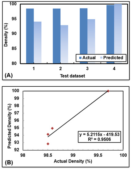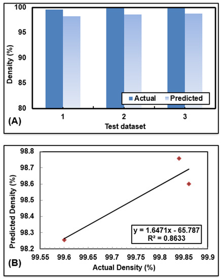 Linear regression: (A) comparison of the actual and predicted density of AM SS316L and (B) statistical correlation between actual and predicted values for the applied model.