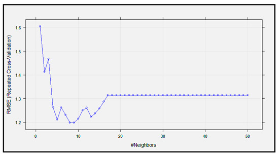 The KNN model is also developed to predict density with 70% of training data. The KNN is an instant-based learning model unusual from general explicit algorithms learning. KNN model is cross verified with the minimum RMSE value, and with the eight neighbors, the optimum value of RMSE was found to be 1.2331, as shown in Figure 8.