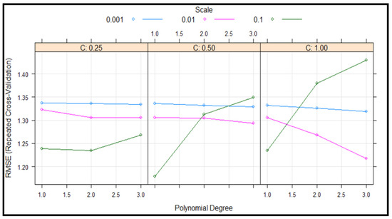 The developed model accurately predicts density with an R-squared value of 0.923, as shown in Figure 10B. The SVM model was validated with RMSE value with different cost functions, as shown in Figure 11. The cost value ensures the smoothness of the hyperplane by selecting the different cost values. This graph shows the optimum value of the cost function for the minimum RMSE value. The minimum RMSE value of 2.096 was obtained at the cost value (C) equal to one. The SVM models are easy to formulate to improve the model’s accuracy. The SVM model performs well even with less sample size than the number of dimensions in the sample data. One of the limitations of the SVM algorithm is the lack of a probabilistic explanation of how the hyperplane classifies the model. The SVM model underperforms with the new dataset consisting of more features.