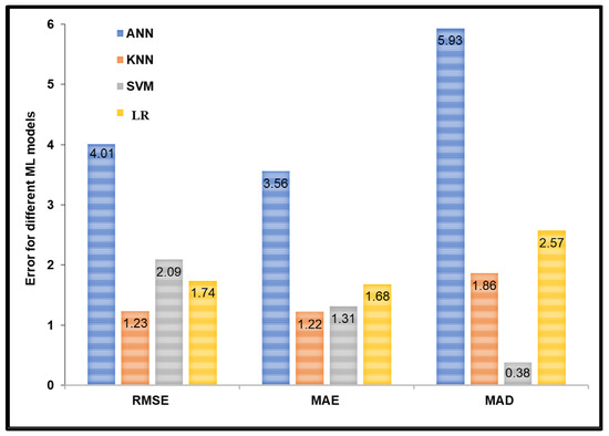 The R-squared value of predicted vs. actual density of dataset for each ML model is compared in the earlier section, as shown in Figure 13. This section compares the prediction error for different ML techniques with the RMSE, MAE, and MAD, as shown in Figure 14.