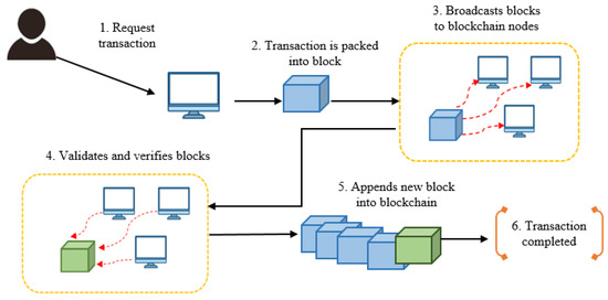 Blockchain is a decentralized and distributed digital ledger that records innumerable information in an encoded format so that the data cannot be tampered with or forged. A blockchain can also be termed as a “chain of blocks”, a distributed data structure replicated on numerous chained nodes using a cryptographic hash where each node is called a block. Each block of the chain is connected to its previous blocks, hence the data stored in a specific block is replicated all over the blocks. This replication provides originality of the block information even if a block is imitated. A node in the blockchain accepts a transaction from an outsider if and only if the transaction is validated by other nodes using a consensus algorithm. After that, the new block is generated and appended to the blockchain. A detailed overview is illustrated in Figure 1 [22,23].