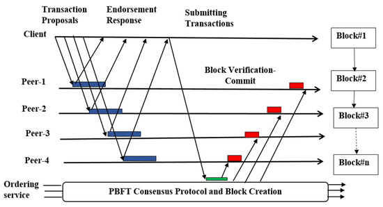 Both Raft and PBFT are leader-based but only Raft is fault-tolerant while PBFT is crash-tolerant. Therefore, Raft does not guarantee the liveliness and security of the network. In a blockchain network, a 50% fraction of the computational power is sufficient to materialize 51% attack. A successful 51% attack can eventually lead to double-spending and DoS attacks. PBFT ensures Byzantine fault tolerance, it has 33% fault tolerance (⅓ of total network nodes) and hence, it avoids synchronous consumption such as other traditional consensus algorithms (PoW or PoS). Moreover, in PBFT, each node of the network must be pre-validated before participating in transaction validation [27,28]. On that account, we designed our proposed work in the HLF platform using PBFT to ensure network liveliness and prevent 51% attack. A schematic representation of HLF organization integrated with PBFT consensus algorithm is presented in Figure 3.