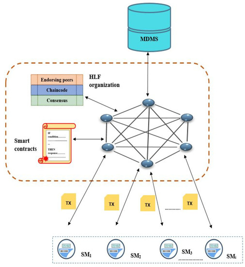 Proposed system model architecture designed with a set of smart meters, smart contract (aka chain code) integrated Hyperledger Fabric blockchain, and MDMS.