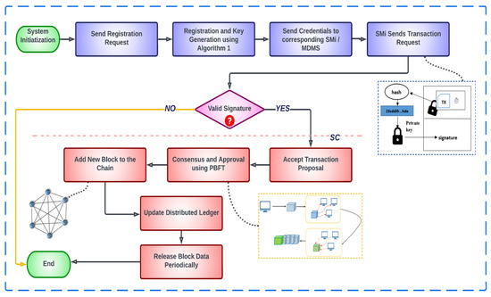 SMi and MDMS represent the ith smart meter and meter data management system in the proposed system model, respectively. These are registered in the permissioned blockchain regulated by DCj. For permissioned blockchain, we used Hyperledger Fabric (HLF); DCj is considered as the client nodes, and SC plays the role of registration and key generation instead of any trusted third party or registration authority. DC only relays the SM and MDMS’s registration to the deployed SC, and verifies transaction requests to the HLF ordering service. The ordering service follows the PBFT consensus mechanism. The ordering service performs a proper transaction validation. The transactions are integrated into a block and added to the blockchain. After a certain period, the blocks are released to the database, which the pre-registered MDMS retrieves.
