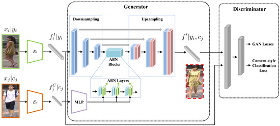 With the rapid development of deep neural networks in the past decade, researchers have explored various deep learning-based methods for person re-ID [2]. Many researchers have tried to solve camera style variance as a part of the optimization problem in a common classification model. Some researchers focus on the innovation of deep learning loss functions. Wang et al. [3,4] study the extension of classification losses based on softmax, while Deng et al. [5] and Hermans et al. [6] investigate the usage of contrastive losses based on hard sample mining. Sun et al. [7] and Chen et al. [8] pay attention to the modification of the base model, which extracts pedestrians’ features. However, these methods sidestep the camera style variance that innately exists in re-ID datasets. Therefore, they cannot solve the camera style variance problem fundamentally.