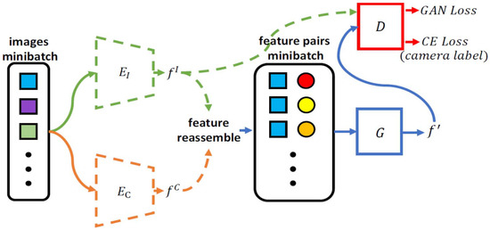 where represents the parameters of generator G and discriminator D. is the real source feature with identity label and camera label , while is the generated feature with the same identity label and different camera label . and denote the distributions of generated features and real features, respectively. Furthermore, WGAN-GP [28] is selected to play the role of adversarial loss, since the authors found its relatively stable performance in the generation objectives. Therefore, a gradient penalty loss is added to confirm the Lipschitz constraint of the entire loss function: