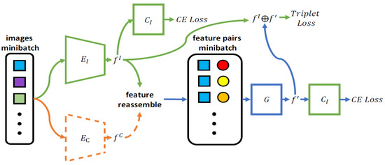 The loss functions use in this stage are introduced in Section 3.2. Through this training stage, the generator G is trained to produce feature . The generated feature maintains the same identity label as the input source feature while the camera label is transferred to , which is the same as target feature .