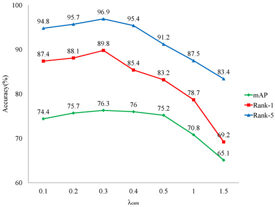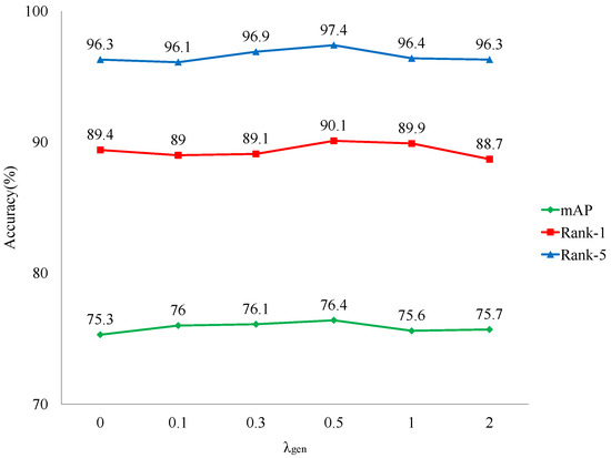 When , the proposed model reaches its best results. It is worth mentioning that the camera style information is not identity-related, so the weight of camera classification loss should not be too large. Otherwise, the generator in the generative model tends to learn overcharged camera information, which does not exist in the input identity feature and corrupts the training process.