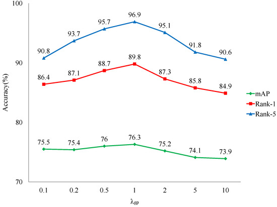 Hyper-parameter analysis of gradient penalty on Market-1501. Best performance achieved when .