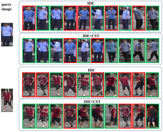 Three re-ID models are chosen as baselines to verify the effectiveness of the proposed CST approach. ID-discriminative Embedding (IDE) [1] is a famous person re-ID baseline proposed by Zheng et al. in 2016; it has been widely studied and used in the re-ID task due to its simplicity and effectiveness. The IDE baseline used in this paper is a slightly improved version (using a batch normalization layer instead of the original fully connected block); it outperforms the original IDE baseline, but it is still refered to as IDE in this paper for simplicity. Part-based Convolutional Baseline (PCB) [7] is a re-ID baseline proposed by Sun et al. in 2018; the authors proposed dividing the input image horizontally and output part-level features. Multiple Granularity Network (MGN) [31] proposed combining global and partial features obtained by a multi-branch deep network. These three baselines represent models based on global features, partial features, and the combination of global and partial features; thus, they are chosen to evaluate the effectiveness of the proposed CST approach.
