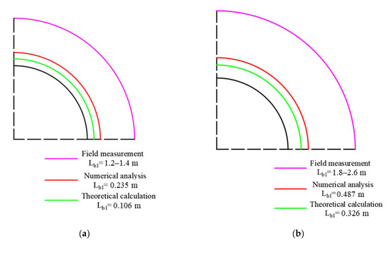 The calculation and numerical simulation results for the range of the stress relaxation zone using the Fenner solution under low ground stresses are shown in Table 4. The calculation results of the stress loose zone thickness Lb1 under different working conditions are shown in Figure 14.