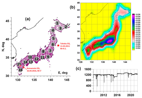 (a)—position of GPS measurement points in Japan (purple dots) and positions of 16 reference points (grey circles), red stars indicate epicenters of Tohoku (11 March 2011, M = 9.1) and Kumamoto (16 April 2016, M = 7) earthquakes; (b)—density of GPS stations; (c)—daily numbers of operational GPS stations in Japan, 2009–2021.