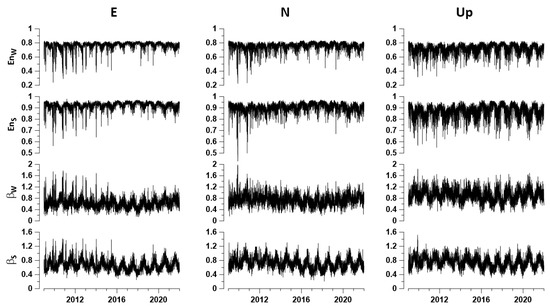 The relationship between the appearance of non-stationary effects in the GPS time series and the processes of slow motions at the boundaries between crustal blocks was analyzed in [16]. Estimates of the non-stationary effects of GPS time series and station positioning stability using discrete wavelet transforms were considered in [17,18]. In [19,20], the coherence of the tremors of the Earth’s surface measured by GPS was studied. An assessment of the fractal characteristics of a high-frequency GPS time series to identify potentially dangerous seismically active regions in Japan and California was used in [21,22,23].