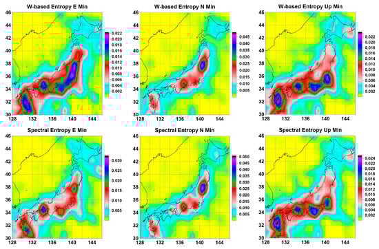Averaged maps of the distribution of the minimum values of the wavelet-based and spectral entropies of the GPS tremor for the displacement components E, N, and Up on a regular grid of 30 × 30 nodes.