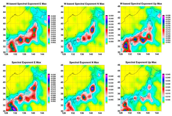 Averaged maps of the distribution of the maximum values of the wavelet-based and usual spectral indices of the GPS tremor for the displacement components E, N, and Up on a regular grid of 30 × 30 nodes.