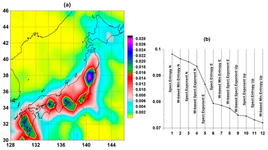 The high correlation of probability density maps of the distribution of extreme values of tremor statistics suggests the use of the principal component method [29] to extract the most common distribution over the space of the most common characteristics. To do this, we find the eigenvector of the correlation matrix (Table 1), corresponding to the maximum eigenvalue of this matrix. The squares of the values of the components of this vector (by definition, their sum is equal to 1) will be taken as the weights of digital maps. The result of the weighted average of the probability densities of the distribution of extreme values in Figure 3 and Figure 4 is shown in Figure 5. Figure 5a contains white contour lines which extract regions where the weighted probability density of minimum entropy and maximum spectral index exceeds the level of 98% quantile. These regions are considered as regions of anomalous GPS-measured Earth tremors.