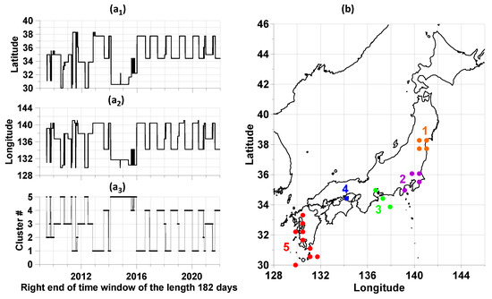 (a1,a2) are the latitudes and longitudes of the nodes of a regular grid of 30 × 30 in size, in which the maxima of the average weighted probability density of the distribution of extreme values of the properties of the tremor of the Earth’s surface were realized in sliding time windows 182 days long; (a3) are the corresponding numbers of clusters of maximum points. (b)—division of points of the trajectory of maxima into five clusters.