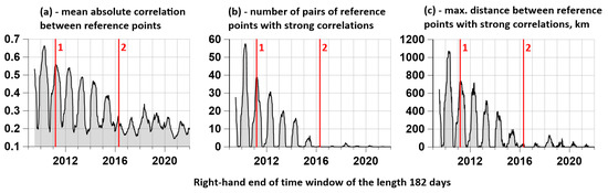 (a) is a plot of mean correlations ; (b) is a graph of the average number of pairs of control points for which the correlations exceeded the threshold of 0.7; (c) is a graph of the average maximum distances between those pairs of control points for which the correlation coefficients exceed the threshold of 0.7. Vertical red lines indicate time moments of earthquakes: 1—Tohoku, 11 March 2011, M = 9.1; 2—Kumamoto, 16 April 2016, M = 7.