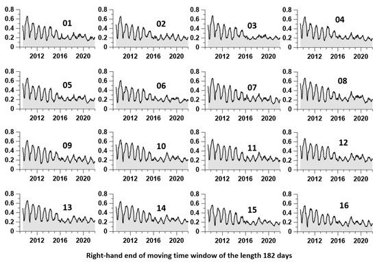 For an auxiliary network of 16 reference points (Figure 1a) 12 time series were determined with a time step of 1 day, the values of which were calculated as medians of the values , , , and from the ten nearest operational GPS measurement points. Figure 2 shows graphs of such time series for central reference point number 8. These graphs show a strong seasonal periodicity of tremor properties.