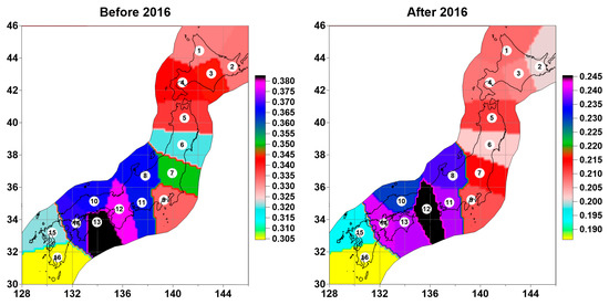 The presence of values in 16 reference points distributed throughout Japan allows the construction of maps of spatial values. The construction of such maps provides additional information on the features of the distribution of the correlation of tremor properties. For this, as before when constructing maps in Figure 3 and Figure 4, consider a regular grid of 30 knots in latitude and 30 knots in longitude covering Japan. Then the values at the nodes of the regular grid are calculated by the nearest reference point neighbor method [26]. These values, calculated for each position of the time window at all nodes, make it possible to obtain “elementary” maps of the distribution over the space of average values of the correlation of the tremor property. The result of averaging all “elementary” maps for time windows lying between some 2 dates gives the corresponding averaged map. Figure 9 shows averaged correlation distribution maps for time windows before and after 2016. The distribution of values is given only for the territory of the Japanese Islands covered by the GPS network of stations and some of their surroundings.