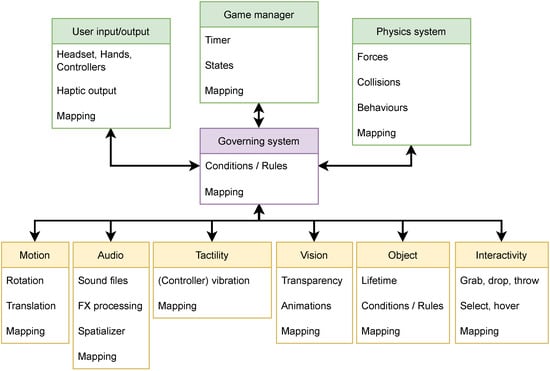 Schematic overview of the proposed system. Data generated by the physics system, game states, or user input/output are mapped to a governing system that coordinates the interpretation and relation of these data to the multimodal representation of objects. The governing system is responsible for the sonic organization and the definition of the objects’ interactive behavior.